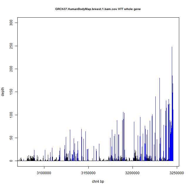 As an example of both of these phenomena, here’s a coverage plot of HTT in human breast tissue from Human BodyMap 2.0. Exons are in blue and introns in black. Note the ~250x coverage at the 3′UTR (far right) trailing off to ~10x by the time you get to the 5′UTR (far left), and the variable coverage of introns in black between the blue spikes of exonic coverage.