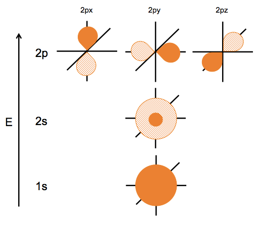 Now consider carbon’s atomic orbitals. Carbon has four electrons if it is isolated. If we bring in four hydrogens to bond with it, making methane, which molecular orbitals will they fill? If they fill just the slots that are left empty by carbon’s electrons, the molecule is lopsided. We know empirically that methane is symmetric, so it must be the case that the 2s, 2px, 2py and 2pz orbitals hybridize to form four equivalent sp3 hybrid orbitals.