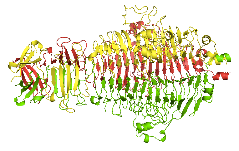 The parallel beta-helix was first introduced in week 3. Some pathogens have parallel beta helices which they use to recognize sugars on the outside of host cells. One of the most famous examples with a known structure is that of the Salmonella phage P22 tailspike, whose function is to recognize and bind lipopolysaccharide. It is a homotrimer [Steinbacher 1994, PDB# 1TSP]: