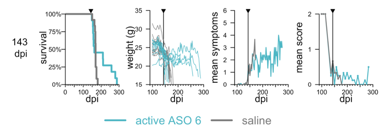 In fact, our first glimpse of how ASOs can work later in prion disease came from an experiment Byron Caughey’s lab did very early on. They gave mice a single dose of ASO at 120 days post-infection, a timepoint when, in their hands, the mice are just a couple weeks away from obvious symptoms. Here’s what they saw: